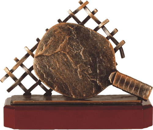 Deze tafeltennis trofee bestaat uit een metalen figuur op een rode voet.